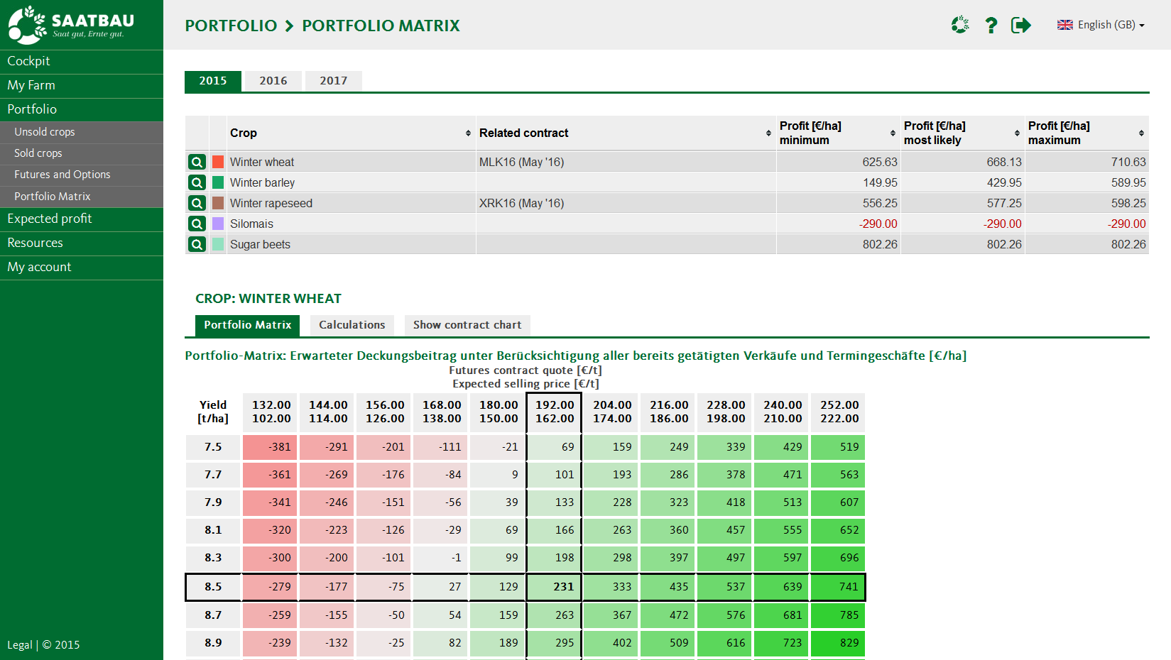 For each crop, the SAATBAU Profit Manager calculates the profit margin per hectare on the basis of the following equation: [Profit margin = (quantity x price) – cost]. While the quantity is estimated by the farmer, a derivation of futures prices is used in the equation and not an absolute price. This is possible, because prices for the next harvest are already traded today at the futures exchanges. However, both quantity and price derivation are uncertain, so the result is a matrix. This matrix shows how the profit margin develops according to variations in quantity and/or prices – i.e. it visualises the risk of negative profit margins. The revenue risk is a function of quantity risk and price risk.